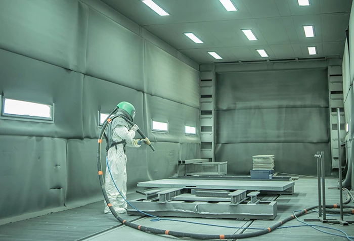 Notre cabine de grenaillage de 15 mètres de long autorise le passage de pièces de grand gabarit. Elle est équipée d'un système de recyclage automatisé de la grenaille.